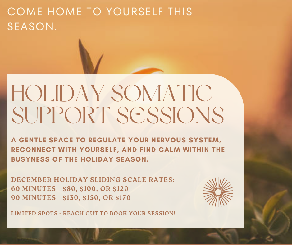 As the year winds down, many of us feel the intensity of the season—full schedules, emotional layers, and a need for deeper rest and connection. These Holiday Somatic Sessions are designed to help you slow down, reconnect with your body, and create more internal space as you move through this time of year.